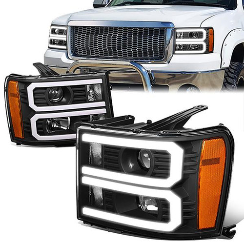 07-14 GMC Sierra 1500 2500 3500 U-Shaped LED DRL Projector Headlights - Black Housing Amber Corner