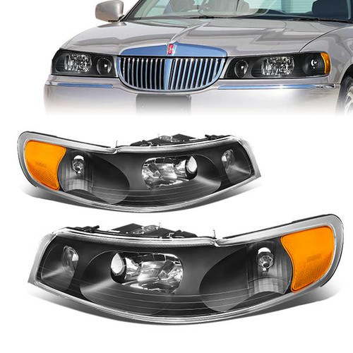 98-02 Lincoln Town Car Headlights - Black Housing Amber Corner